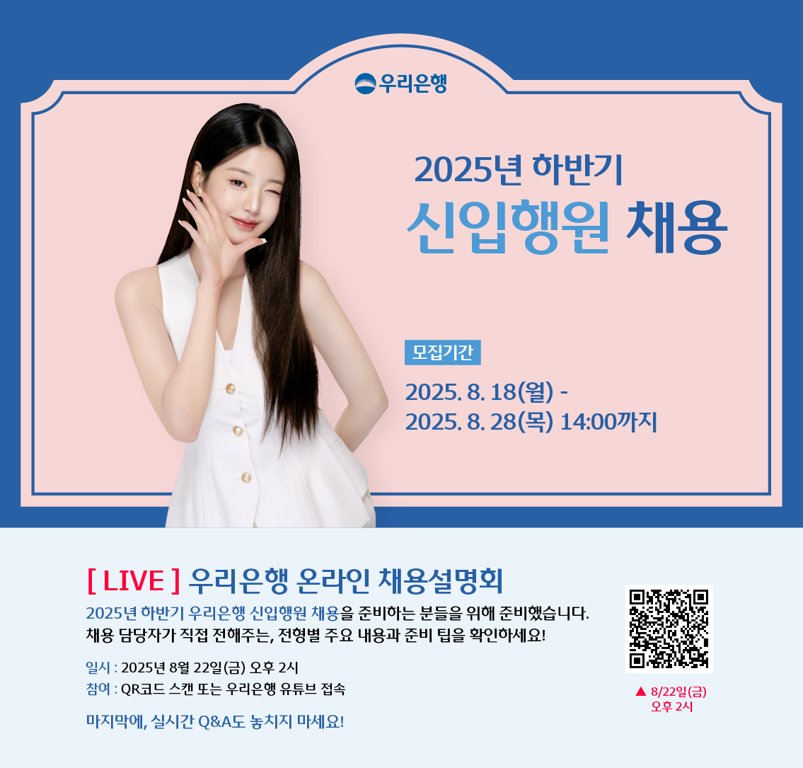 우리은행 2025 하반기 채용 설명회 및 상담회 일정을 아래와 같이 알려드리니, 관심 있는 학생들이 참여할 수 있도록 안내하여 주시기 바랍니다.