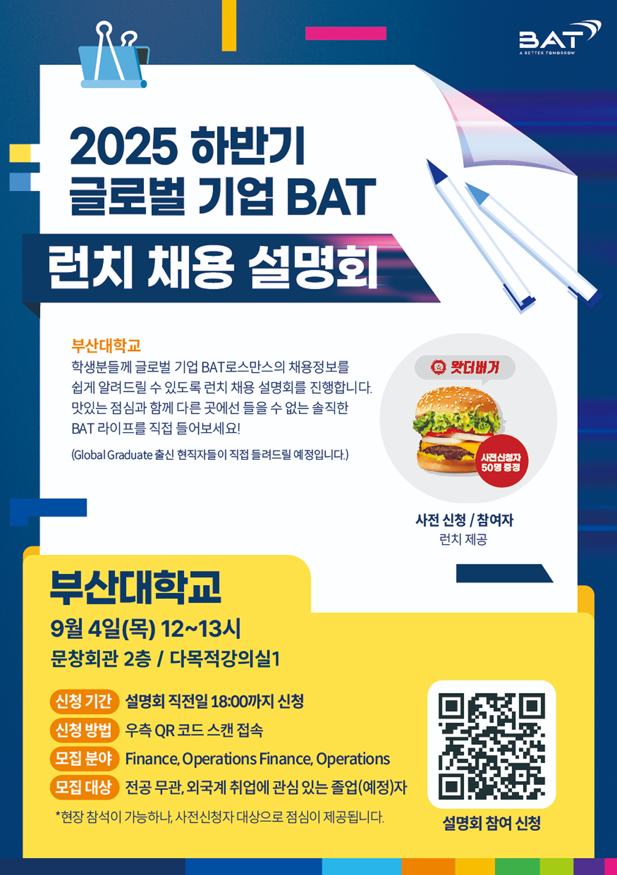 British American Tobacco 2025 하반기 채용설명회 일정을 아래와 같이 알려드리니, 관심 있는 학생들이 참여할 수 있도록 안내하여 주시기 바랍니다.